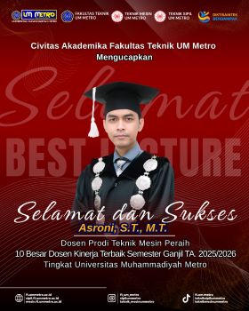 Segenap Civitas Akademika Program Studi Teknik Mesin UM Metro memberikan apresiasi setinggi-tingginya kepada Bapak Asroni, S.T., M.T. atas capaian "Selamat dan Sukses" ini. Momentum prestasi ini diharapkan dapat terus memotivasi pengembangan ilmu pengetahuan dan teknologi di lingkup Teknik Mesin, serta memperkokoh posisi program studi sebagai pusat unggulan pendidikan teknik di wilayah Lampung
