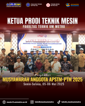 Ketua Program Studi (Kaprodi) Teknik Mesin Universitas Muhammadiyah Metro menghadiri Musyawarah Anggota Asosiasi Program Studi Teknik Mesin Perguruan Tinggi Muhammadiyah (APSTM-PTM) tahun 2025 yang diselenggarakan pada Senin–Selasa, 5–6 Mei 2025. Kegiatan tersebut berlangsung di Hotel Horison Ultima-Banten, dan dihadiri oleh Anggota APSTM-PTM (Kaprodi dan Sekprodi), serta seluruh jajaran pengurus APSTM-PTM.