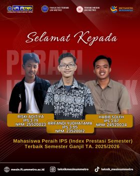 Metro, 13 Maret 2026. Program Studi Teknik Mesin Fakultas Teknik Universitas Muhammadiyah Metro memberikan apresiasi kepada mahasiswa yang berhasil meraih Indeks Prestasi Semester (IPS) terbaik pada Semester Ganjil Tahun Akademik 2025/2026. Pencapaian ini menjadi bentuk penghargaan atas kerja keras, kedisiplinan, dan semangat belajar mahasiswa dalam mengikuti proses perkuliahan.